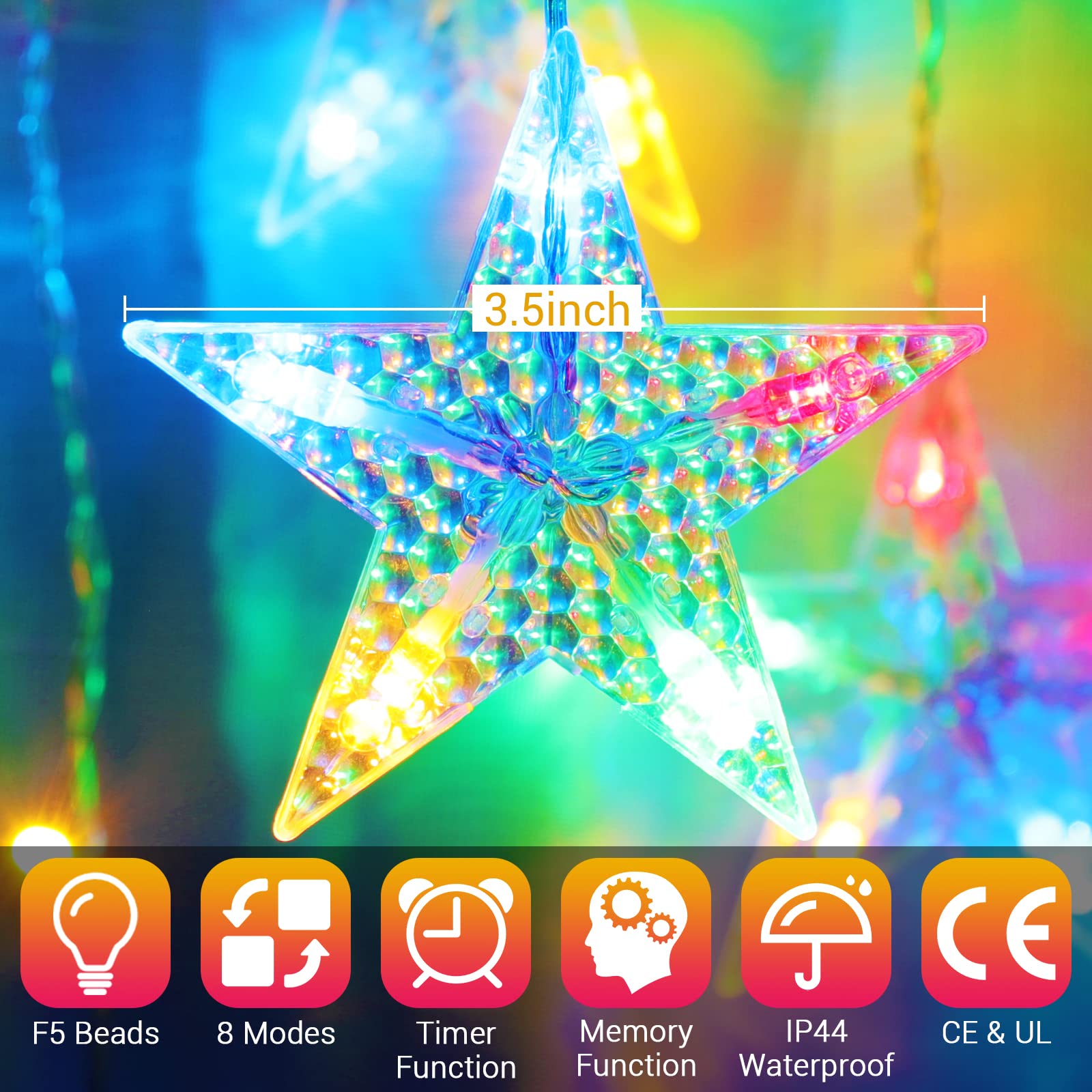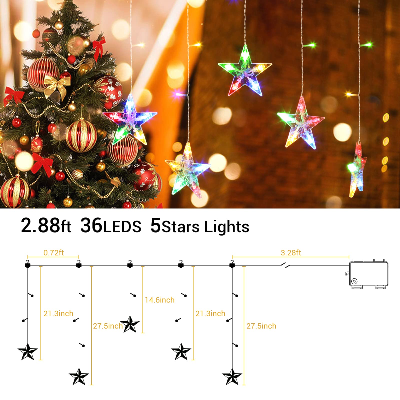- ⭐【F5 Beads & Beautiful Decoration Effect】Marchpower Christmas Curtain Lights consist of 5 Stars and 36 LED F5 Beads, which are more brighter than normal LED and have a beautiful lighting effect. The multicolor star curtain lights have four colors: red, yellow, blue, and green. Star string light total length 2.88ft+3.28ft lead.