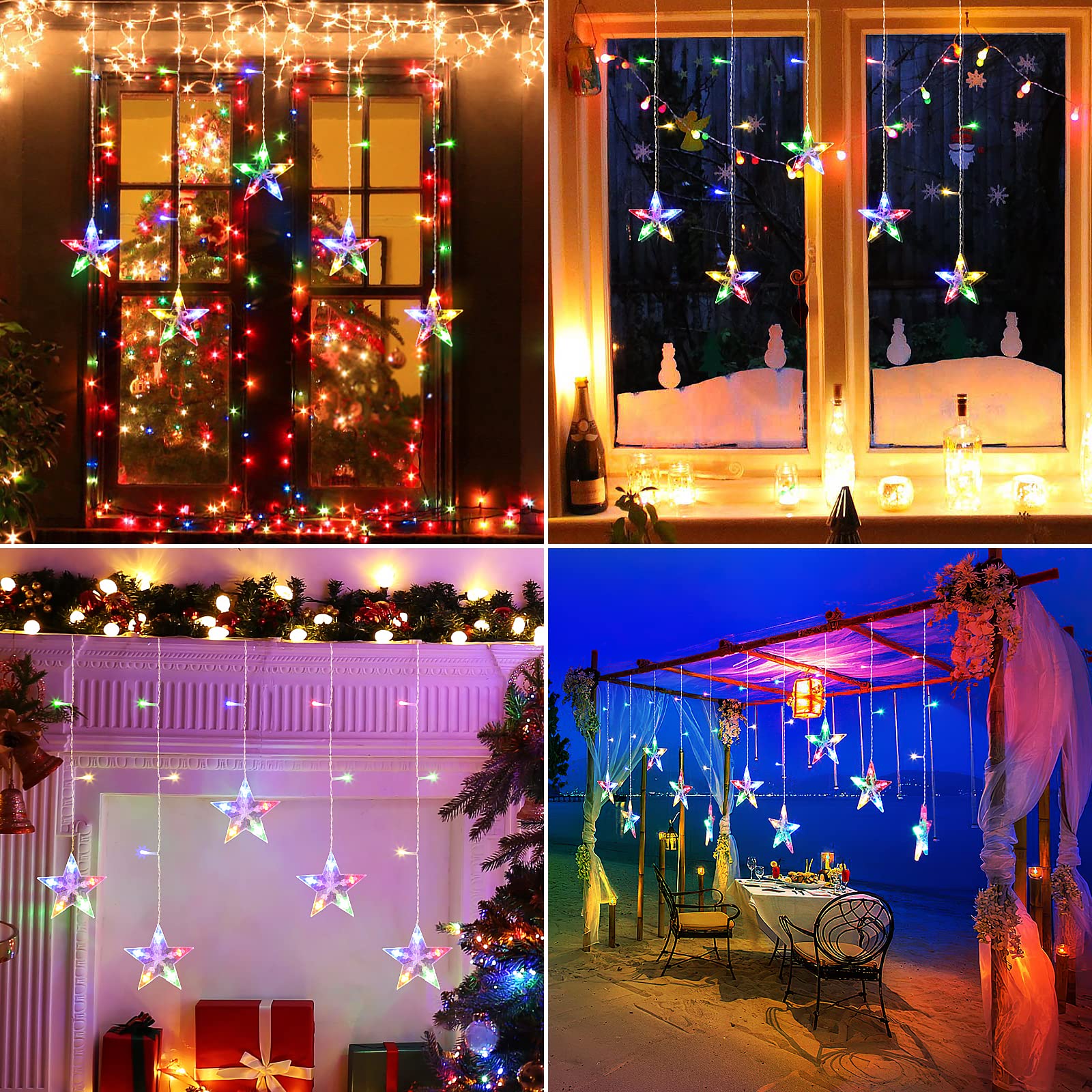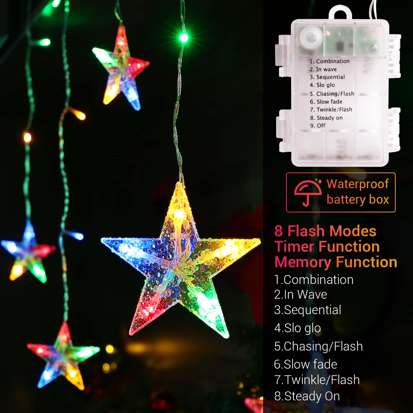 - ⭐【IP44 Waterproof & Indoor Outdoor Use】Our Star Curtain Lights and battery box are IP44 Waterproof and Snowproof, perfect for Indoor and Outdoor, Christmas, Window, Garden, Party, Home, Festival, Holiday, Ramadan easter, etc. (NOTE: The Star Curtain Lights do not include 3*AA battery.)