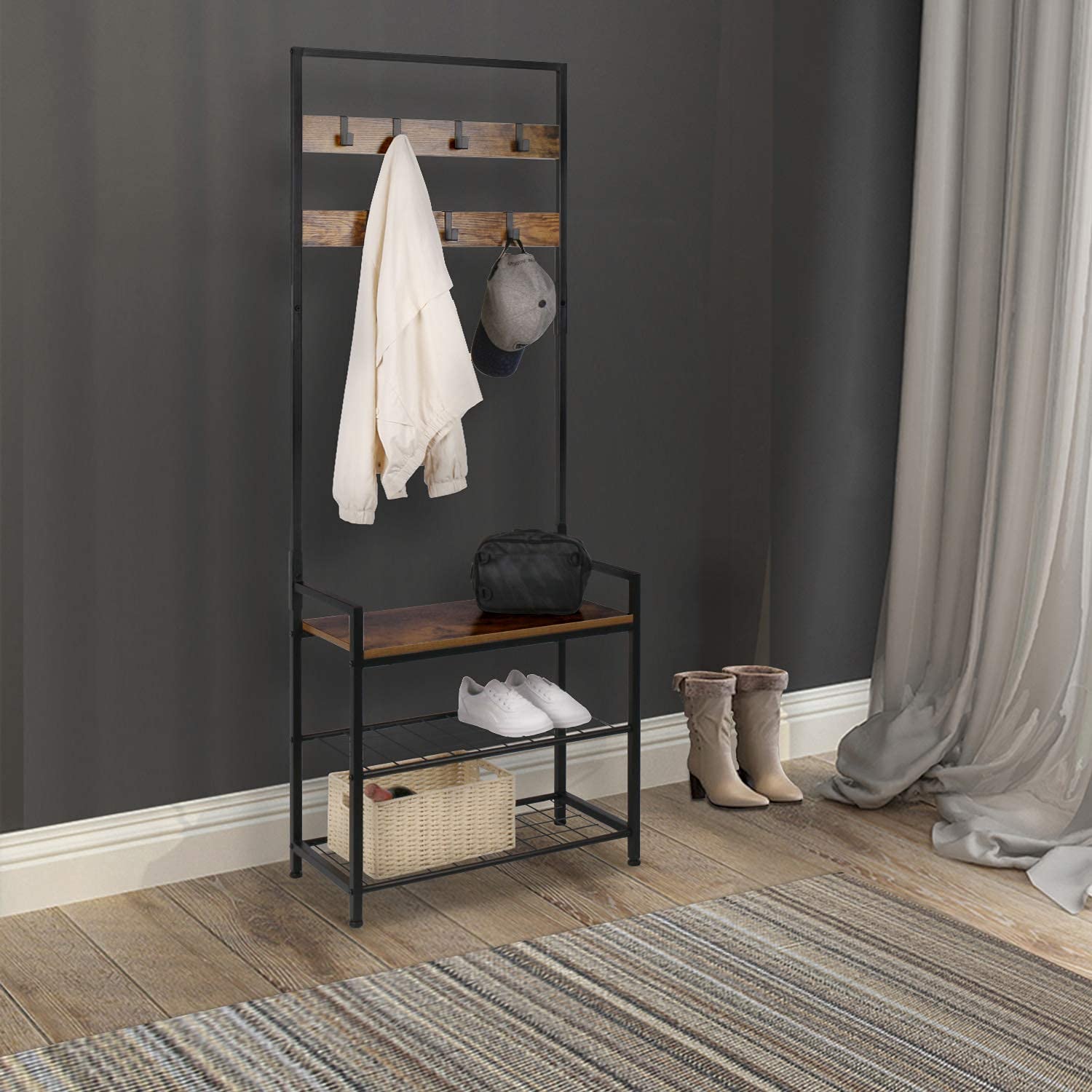 The coat rack provides hooks for hanging coats, hats, scarves, or bags, keeping them easily accessible yet neatly organized. The shoe bench allows for comfortable seating while putting on or removing footwear, complemented by a lower shelf designed for shoe storage or display.