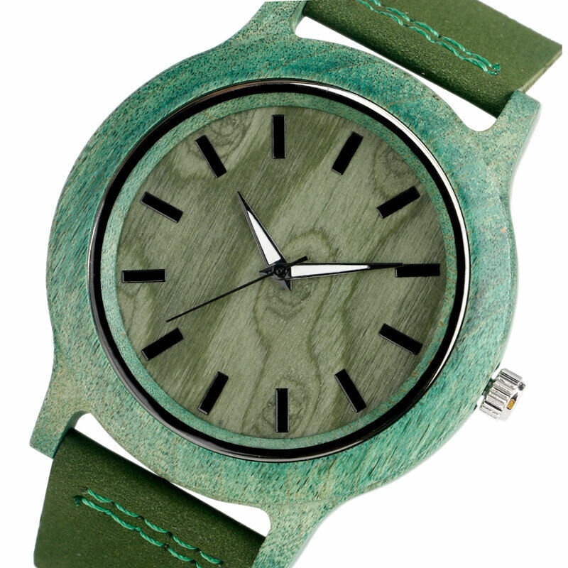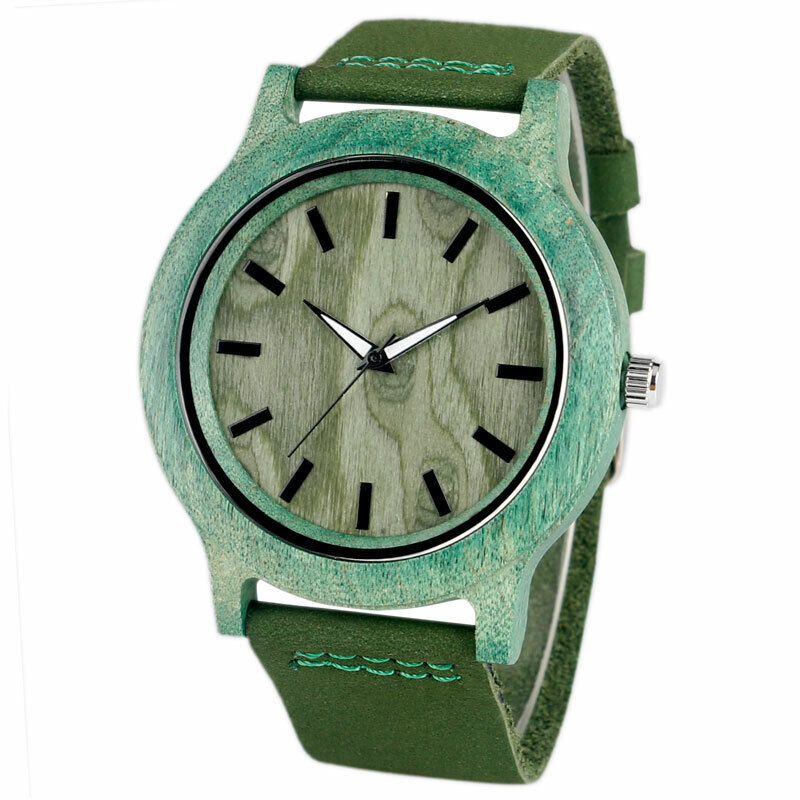 Adorned with a stylish green leather band, the watch adds a modern and fashionable appeal to its overall design. The fusion of green leather with the natural wooden frame creates a striking contrast, making it a versatile accessory suitable for various occasions. It's a fashion-forward choice for individuals who value contemporary aesthetics and want their watch to make a statement.