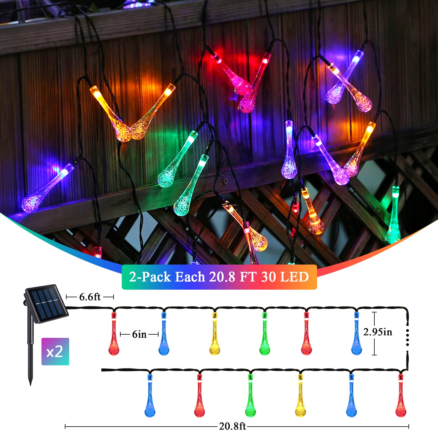 Specification: 2 Pack *30 LED water drop solar lights, Lead wire Length: 200 cm/6.6 ft; Space between LEDs: 15 cm/6 inch, Lighting Length: 435cm/ 14.2ft, Total Length: 635 cm/ 20.8 ft.