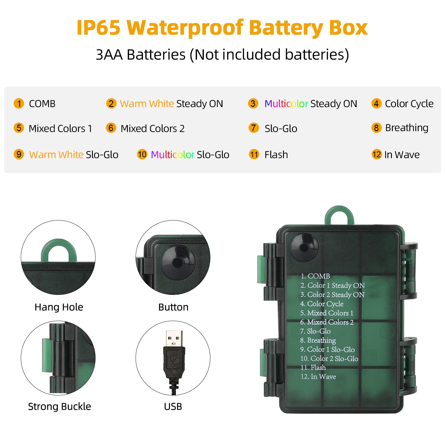 【Christmas light with 8 modes & Memory Function】Press the button on the battery box to select the mode from 8 options: Combination, In wave, Sequential, Slo glo, Chasing/Flash, Slow fade, Twinkle/Flash, Steady on. Timer and Memory function will be activated as you turn the string lights on, no more operation needed.