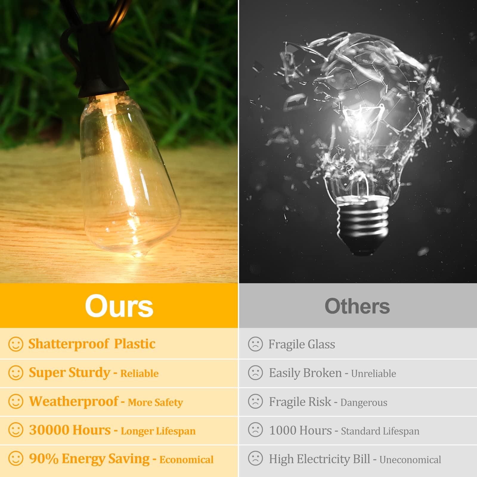 【Weatherproof and Safer】- With our weatherproof technology, these durable outside string lights can withstand rain, wind, snow, and extreme temperatures up to 158 degrees Fahrenheit for you to leave them outside year-round confidently. Furthermore, the bulb shells are made of hard anti-drop plastic, protect you and your family while hanging the waterproof backyard string lights, no more worries about the suddenly broken glass shards.