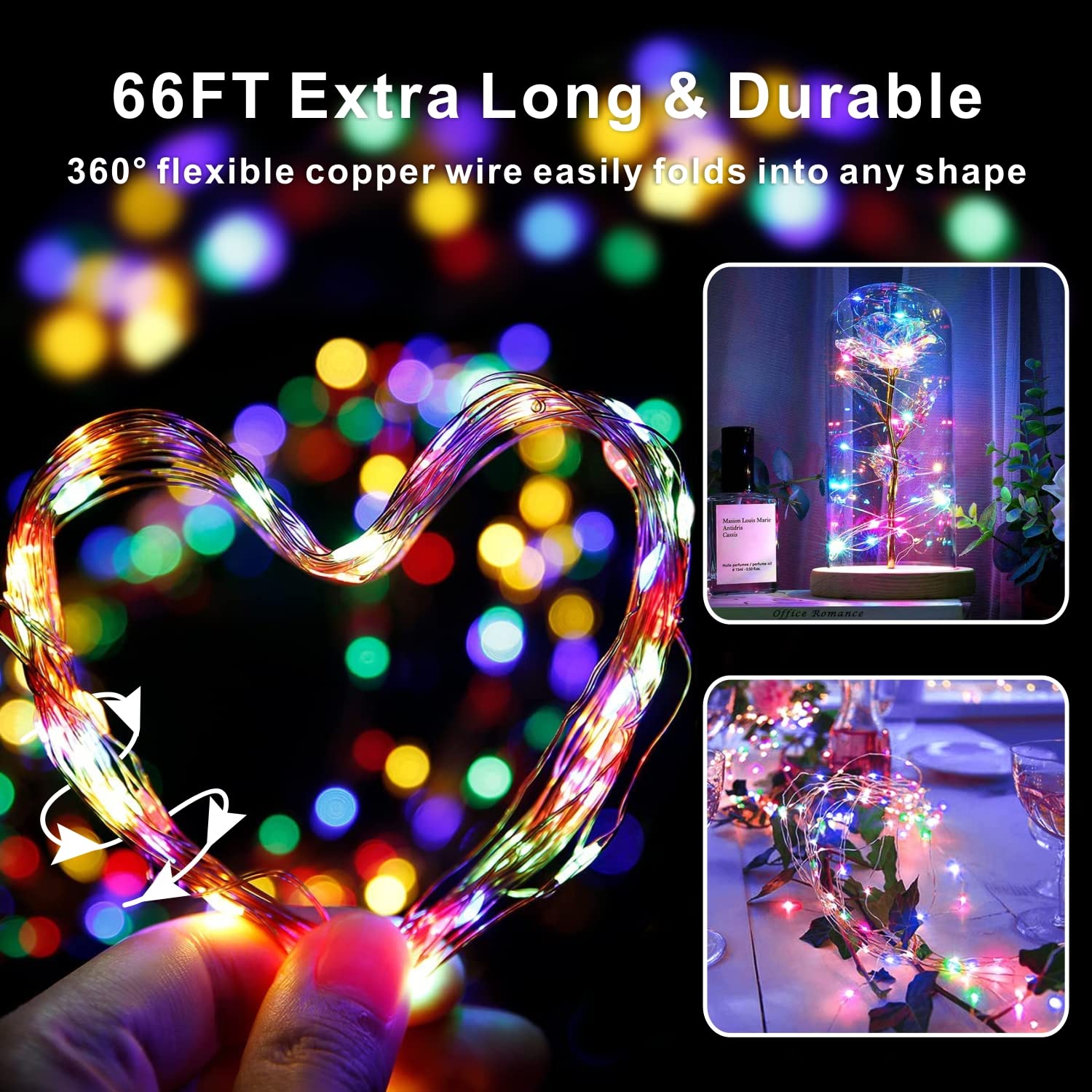 - LONG FLEXIBLE SAFE WIRE LIGHTS: This durable led fairy light line is made of pure 66 feet soft copper wire. It can be bent to any shape easily over a thousand times, and it will not break. 66ft is long enough for any indoor and outdoor decor.It is low heat emission, and safe to touch.