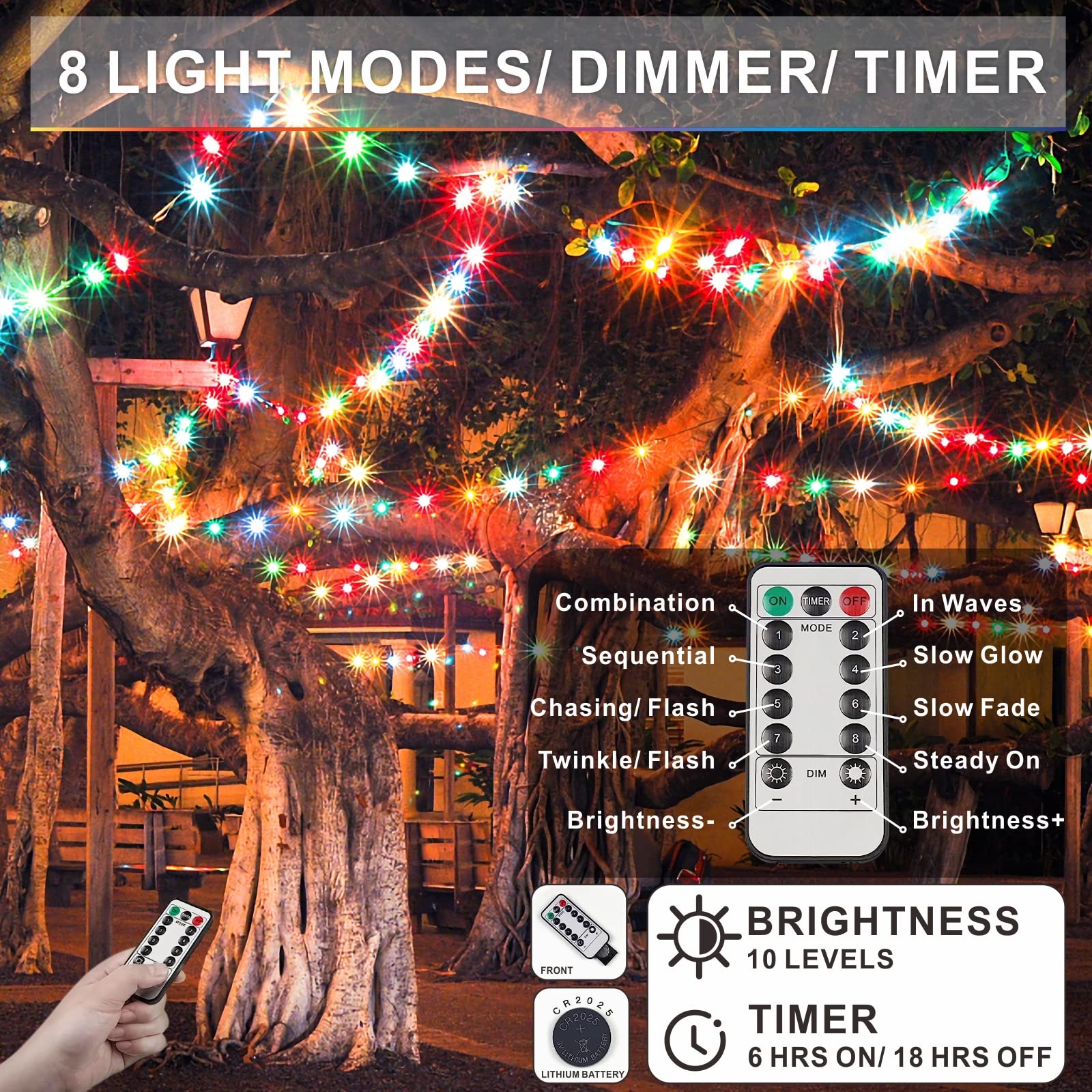 - 8 SCENE MODES, 10 BRIGHTNESS ADJUSTMENT: You can choose 8 lighting modes: combination, sequential, in waves, slow glow, flash, slow fade, twinkle and steady on. Timing function: 6h on 18h off. The dimmable light include 10 brightness adjustment levels. It is recommended to use the remote control within 16.4ft.