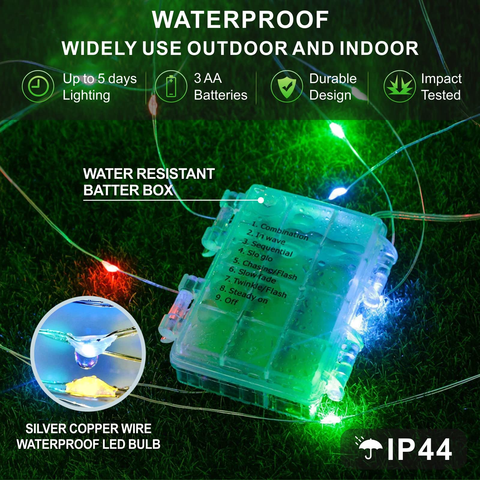 - IP67 WATERPROOF FAIRY LIGHTS: The decorative copper wire string lights is sealed and IP67 waterproof completely, can keep flashing and shining during wet weather outdoor. The IP44 waterproofed battery box can against wet under splashing water at any angle.