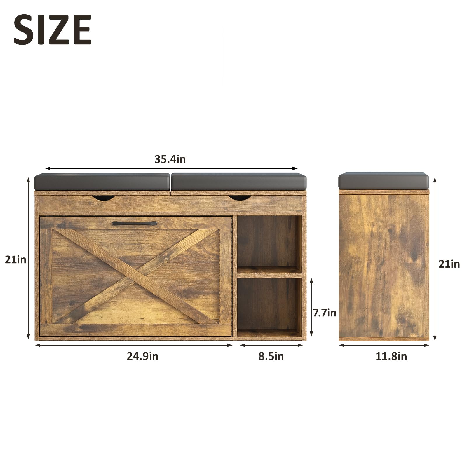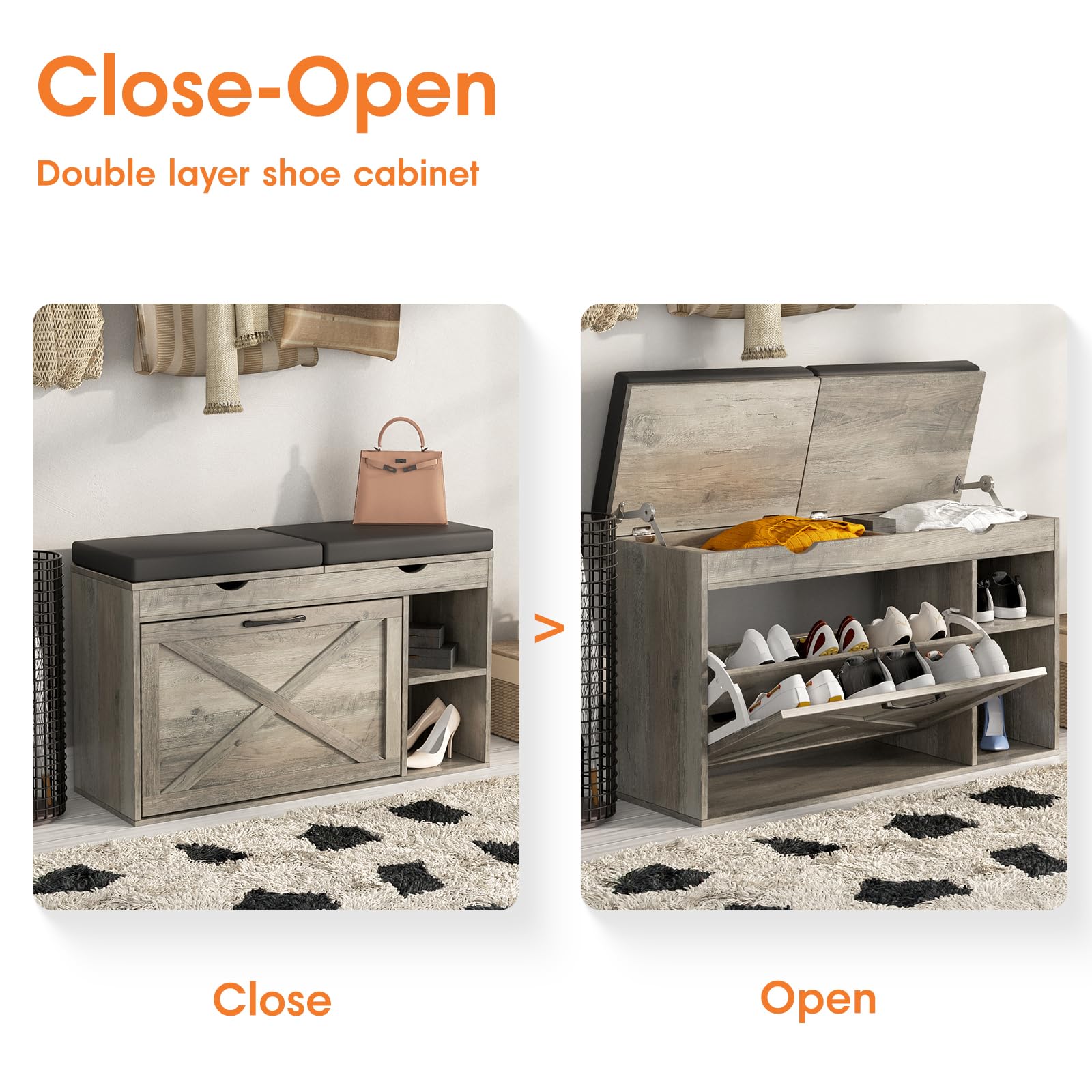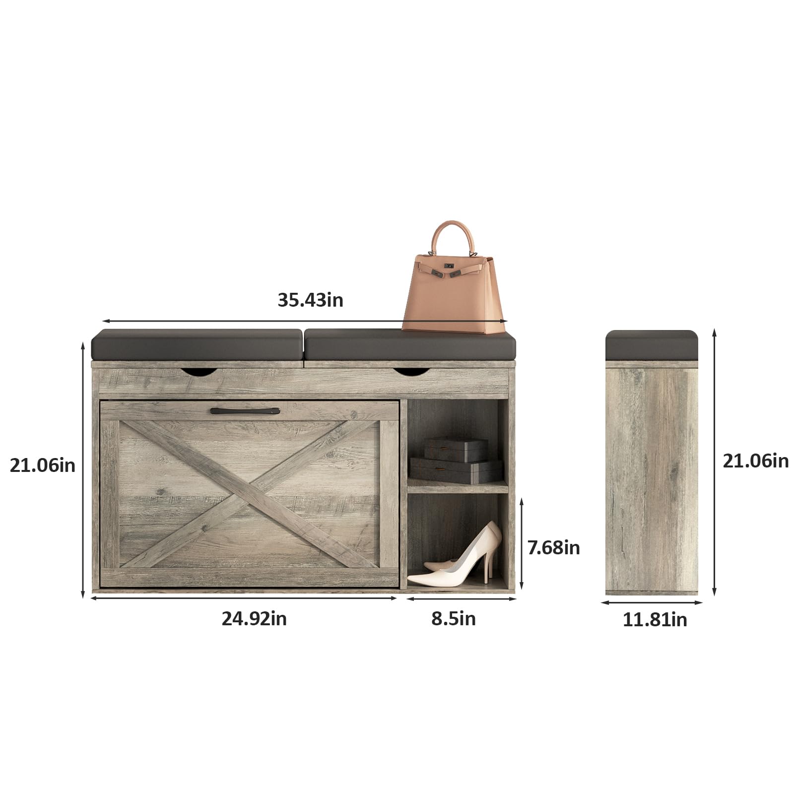 【Entryway Bench with Shoe Storage】 : Hidden shoe bench with flip drawer shoe cabinet and removable seat cushion. The elegant X-panel paired with a rustic washed gray, farmhouse style fits any decor. Perfect for placing in the entryway, hallway, living room, or porch, provides a neat looking in your home and space saving.
