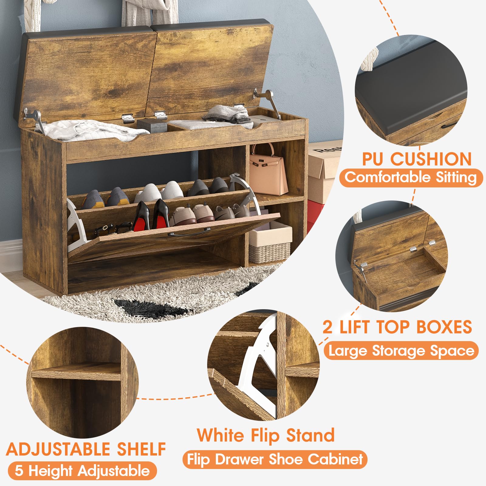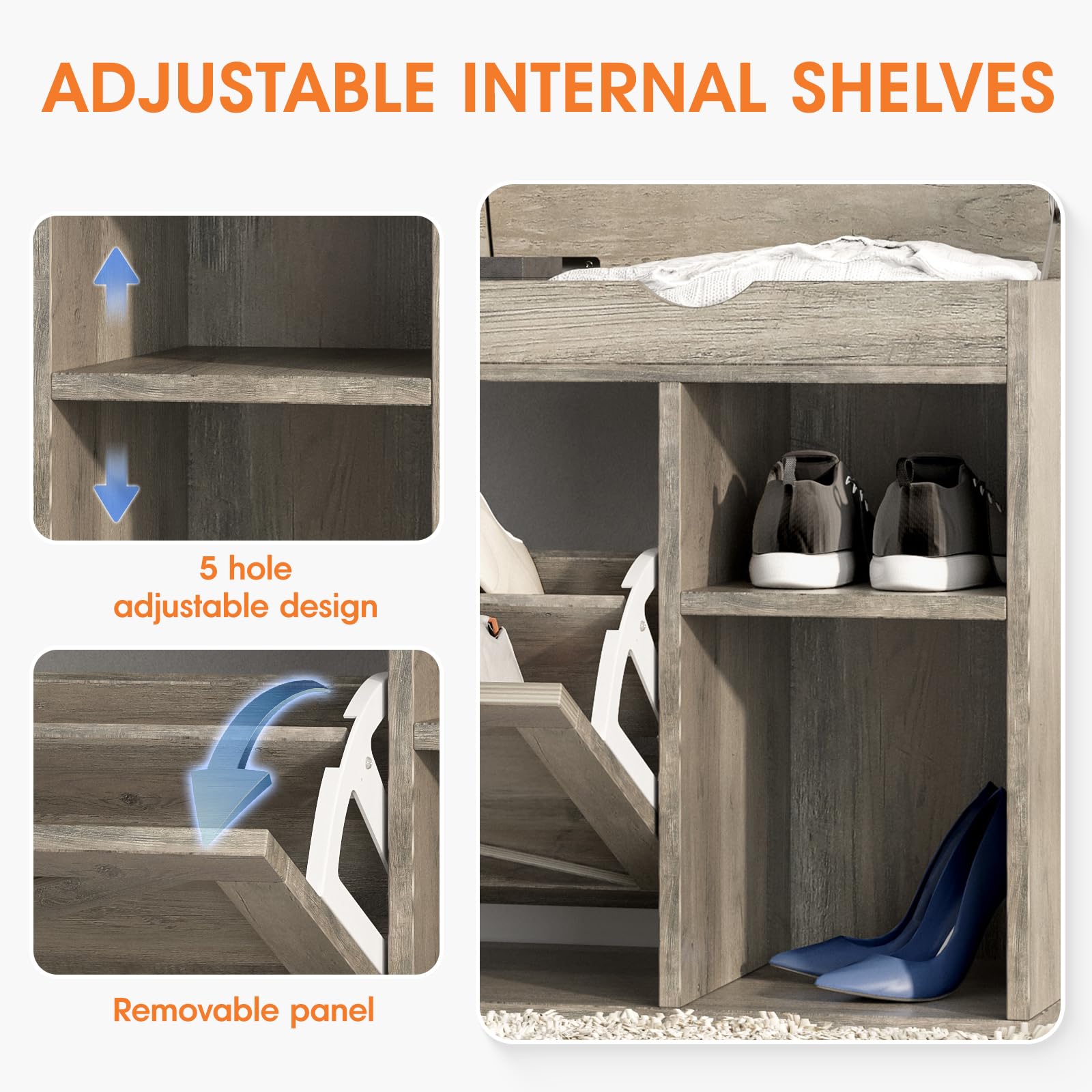 【Large Capacity Shoe Bench 】: 2 Lift top storage boxes can store umbrellas, scarves, children's toys, pet supplies and more. The high-quality metal bracket ensures that the storage box can withstand years of opening and closing. 2 Storage compartments on the right, with adjustable panels in the middle, 5 adjustable heights, the shelf can even be removed for boots.