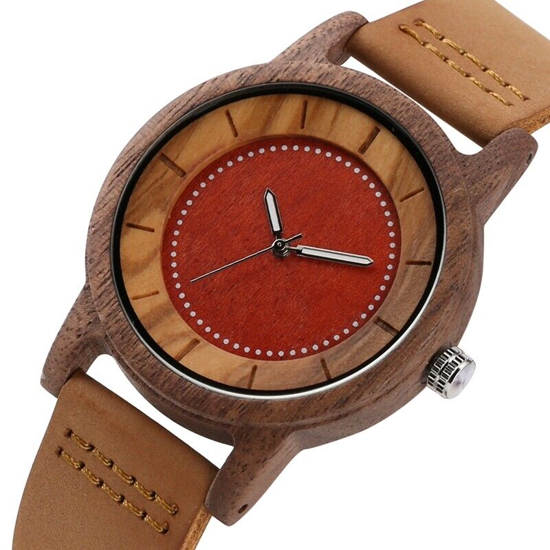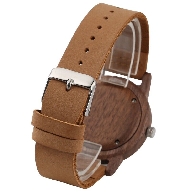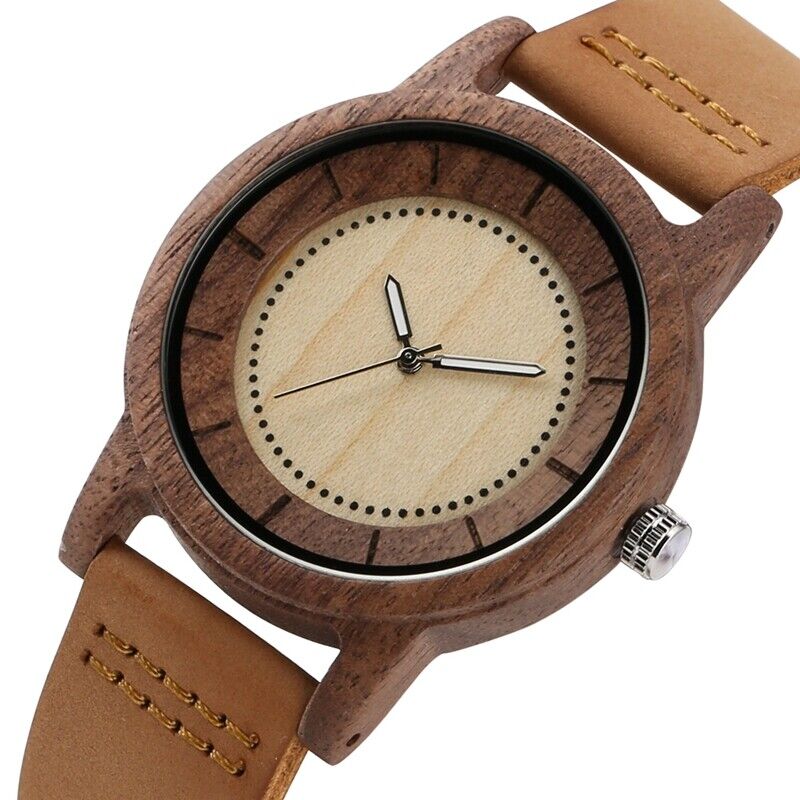 A classic leather strap complements the wooden design, creating a harmonious blend of style. The leather not only adds a touch of timeless sophistication but also ensures the watch is suitable for a variety of occasions. This versatility allows the watch to effortlessly transition between casual and formal settings.