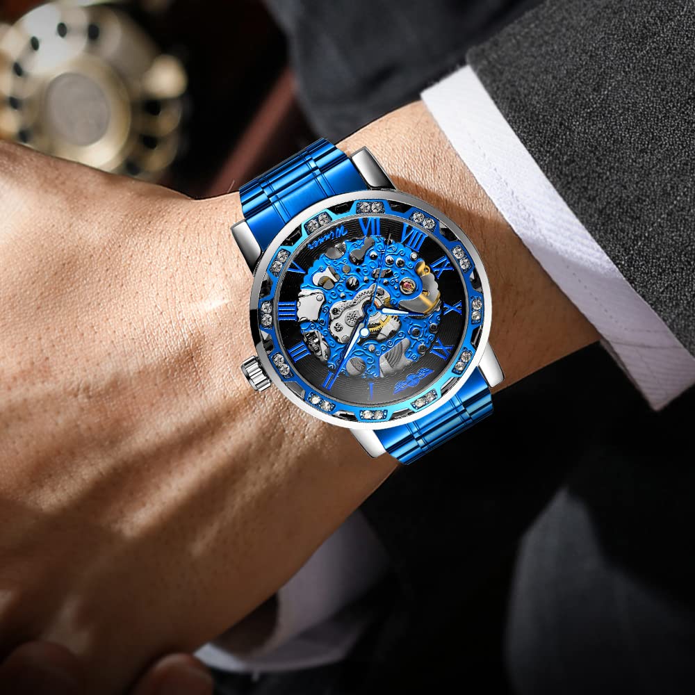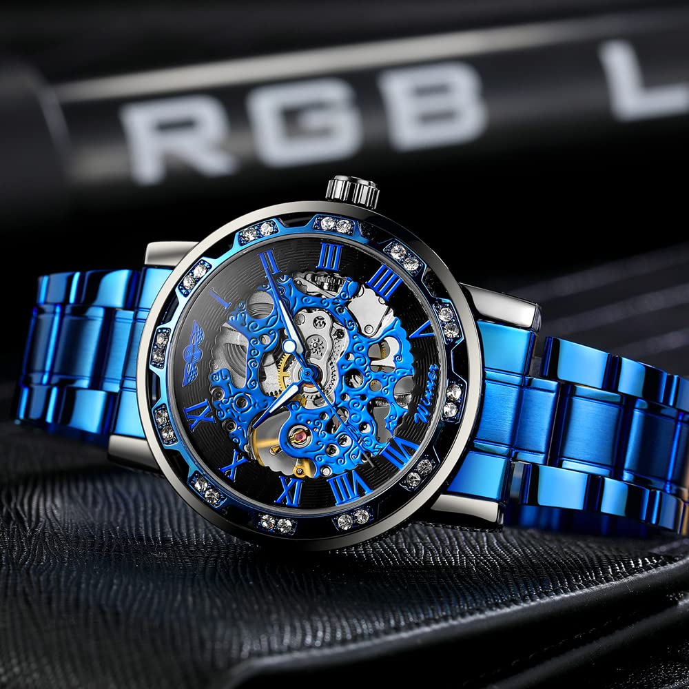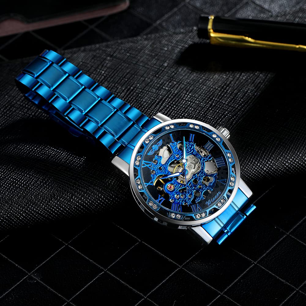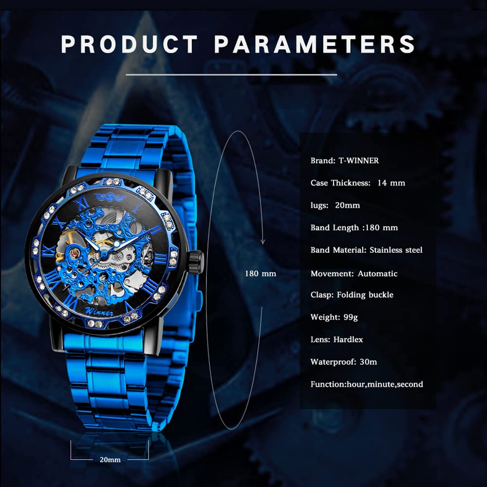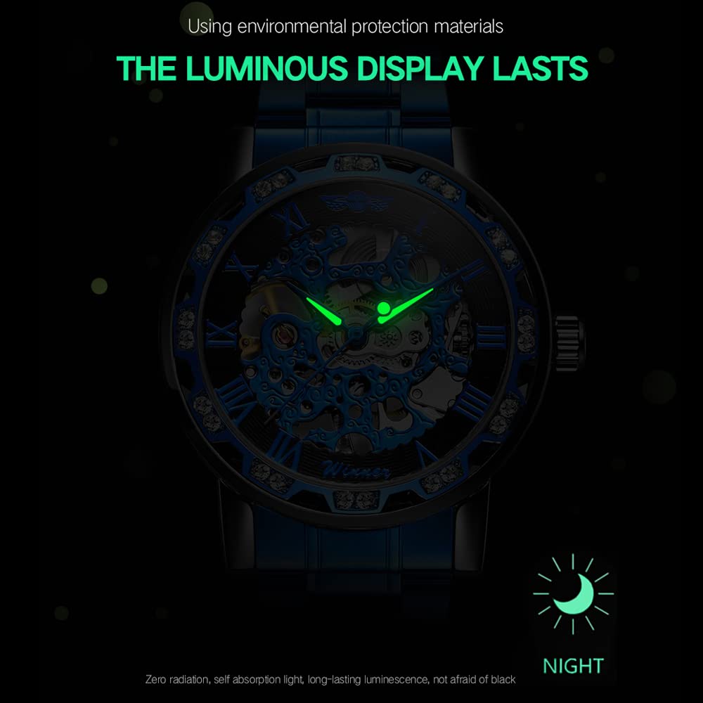 - 【LUXURY STEAMPUNK STYLE】Luxurious diamond design ,Classic skeleton dial, Roman numeral dial, give you exceptional artistic beauty.This skeleton watch with a transparent lower cover, you can see the movement of the watch movement.