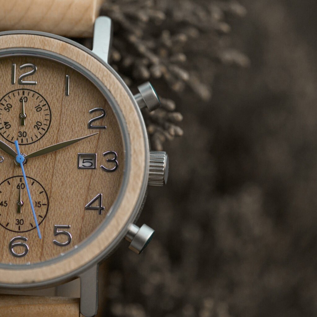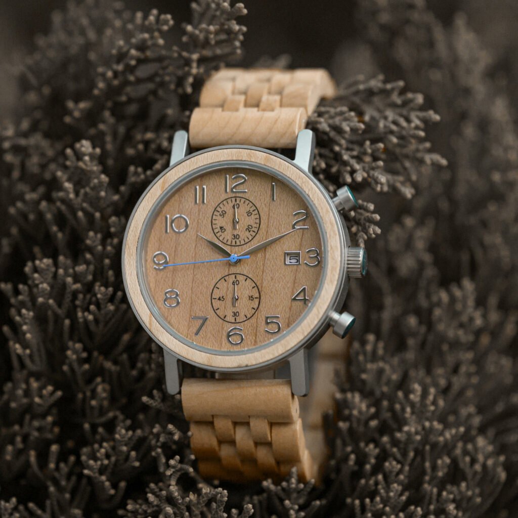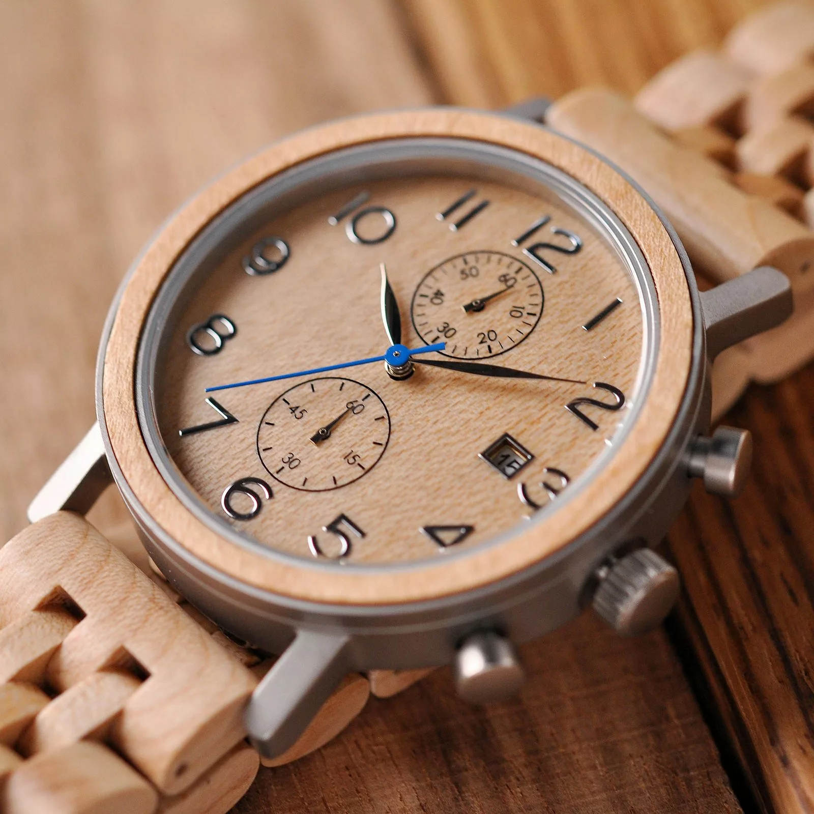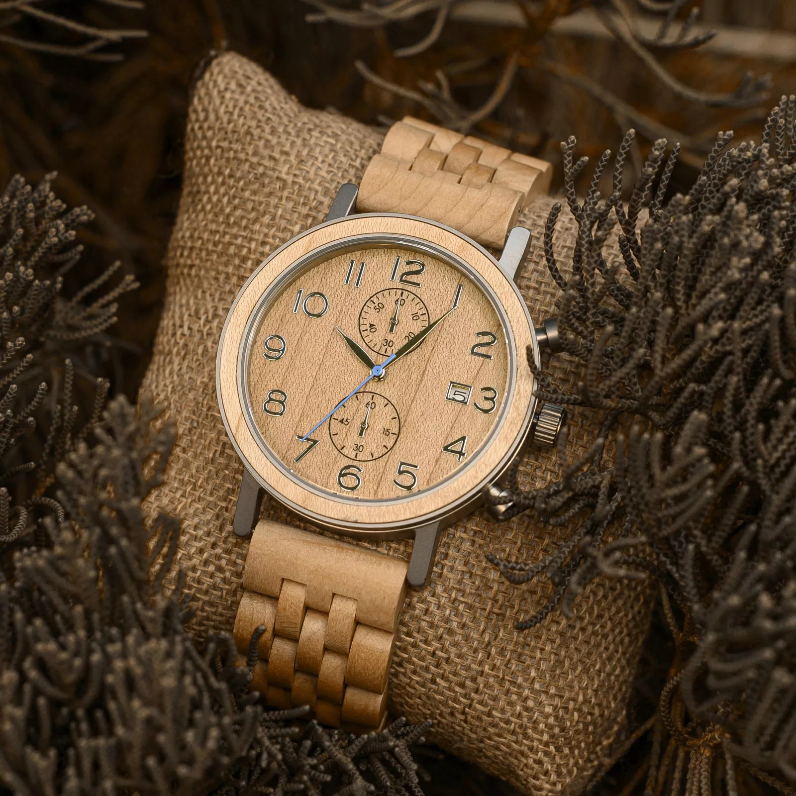 Natural Maple Wood Timeless Elegance Showcase: Showcase the timeless elegance of the watch's natural maple wood case. The natural grain patterns and warm tones of the wood create a visually stunning accessory that serves as a testament to the beauty of nature.